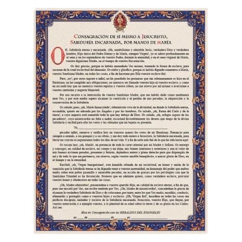 Este Pergamino de Consagración contiene la oración de la consagración a Jesús por medio de la Virgen María, según el método enseñado por San Luis María Grignion de Montfort. Es un hermoso recordatorio del compromiso de vivir bajo la guía y la protección maternal de la Santísima Virgen.